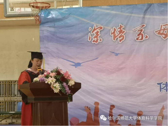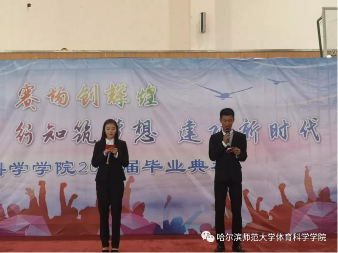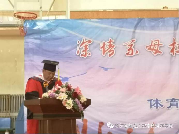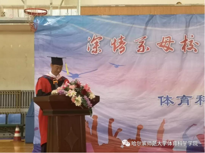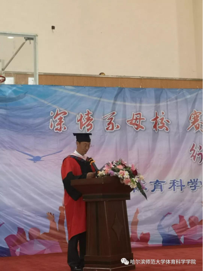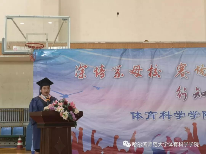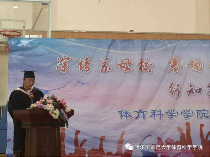毕业典礼开始由2015级体育教育本科毕业生刘超伟发言。