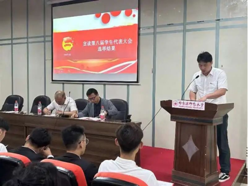 大会第六项,2022级辅导员李想老师宣读第八届学代会代表选举结果。