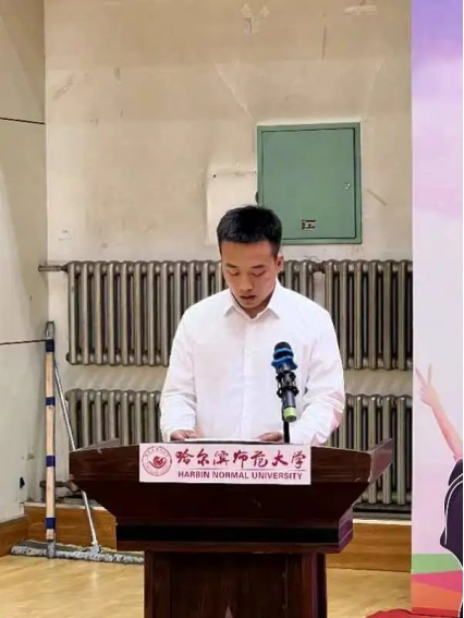在校生代表于江发言,为即将毕业离校的学长学姐送上最衷心的祝愿,愿学长学姐们带着体育人的精神踏上新的征程,勇往直前去追求平凡中的卓越,开启人生新的篇章。表示要脚踏实地继续用我们的青春和智慧续写辉煌篇章。