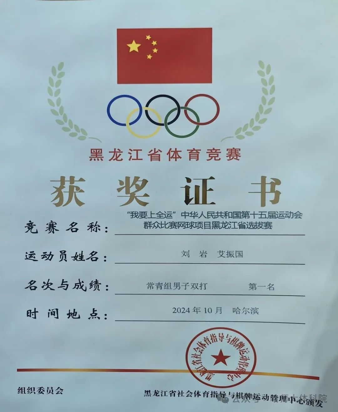 教师刘岩于2024年10月积极参加了由黑龙江省体育局主办的“我要上奥运”中华人民共和国第十五届运动会群众比赛网球项目黑龙江省选拔赛。本次比赛汇聚了众多网球爱好者,共设置了青年男单、青年女单、中年双、中年女双、常青男双、常青女双六个单项赛事。