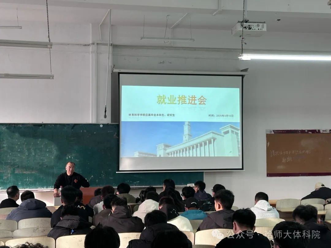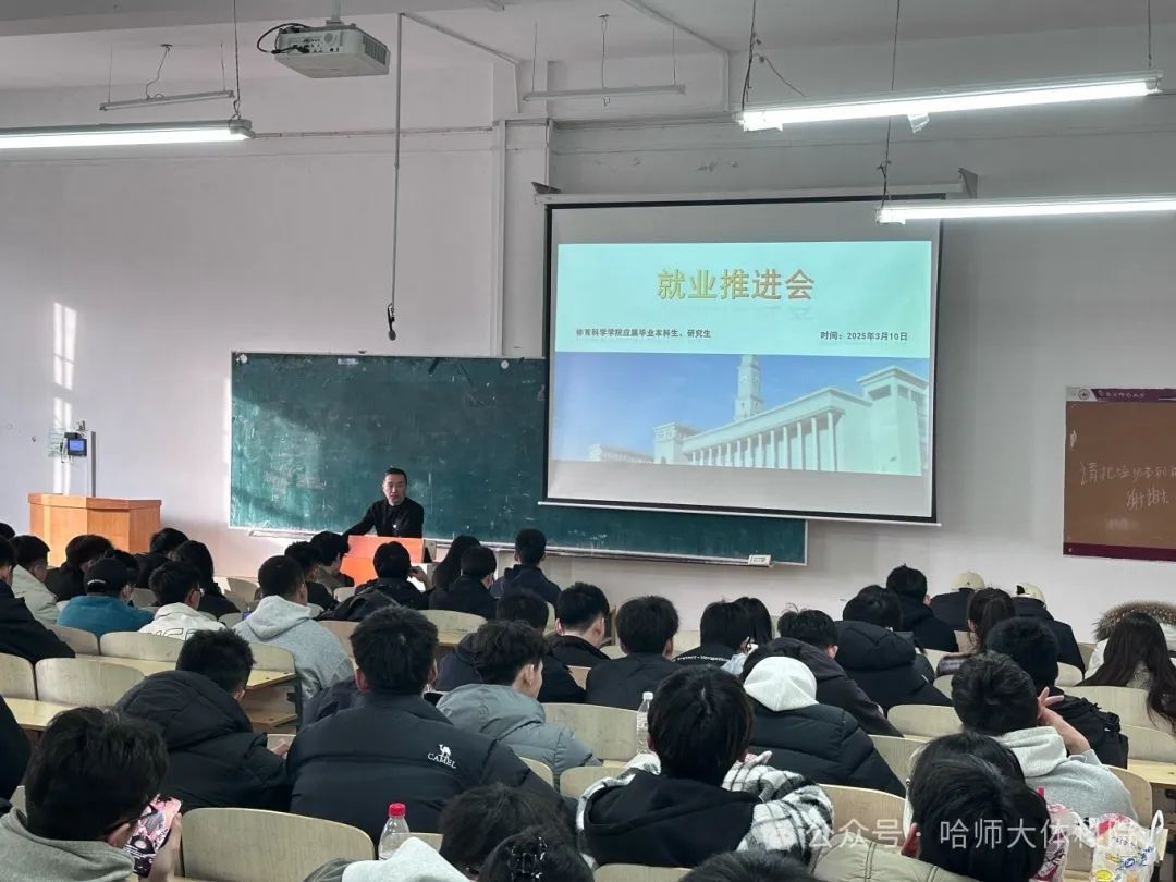 于人文楼127召开应届毕业本科生、研究生就业推进会,本次会议21级辅导员李朝旭主持,党委副书记冯铁南、研究生辅导员任彦波主讲。