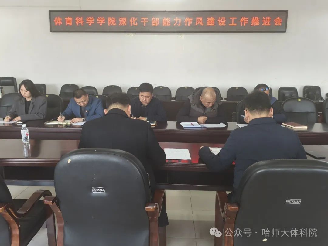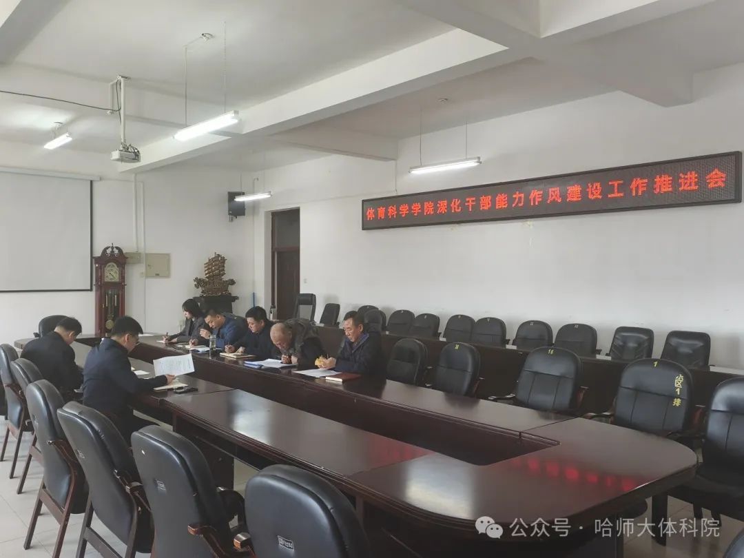 党委班子在体育楼401会议室召开学院深化干部能力作风建设工作专题推进会,党委班子全体成员参加,党委书记韩大伟主持会议。