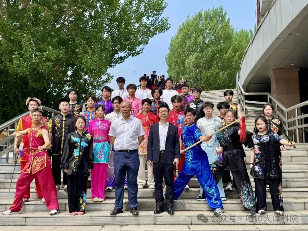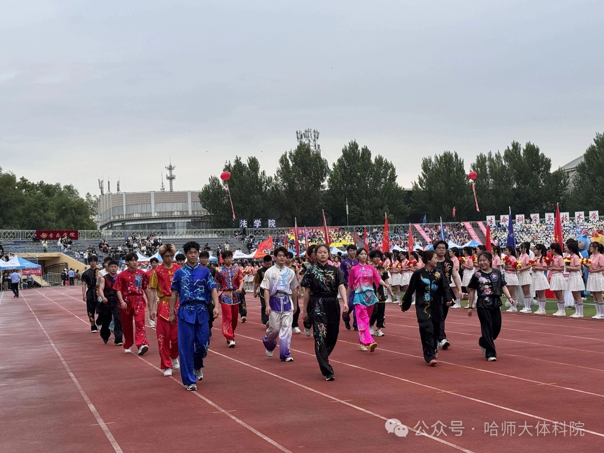 李文胜和付艳敏老师精心编排指导的武术团体操震撼登场。民族传统与武术专业表演方队的队员们身着传统武术服饰,精神抖擞、意气风发。展现了专业扎实的教学成果,更以磅礴气势诠释了哈师大体育人对中华优秀传统文化的传承与发扬。由民族传统体育与武术专业学生组成的 50人团体操队伍,在学院专业教师精心编排,辅导员刘万鹏统筹指导的武术团体表演震撼登场。队员们身着中华传统服装,动作整齐划一,旗舞如风,猎猎作响;集体长拳虎虎生风,单项表演令人眼花缭乱,拳似流星,剑光流转如寒星坠地,棍法刚猛绝伦,枪出如游龙,九节鞭破空炸响似惊雷,集体刀术更是刀花翻滚,耀眼生辉…队伍阵型变幻莫测,从“北斗七星阵”到“太极双鱼图”,再到气势恢宏的太极拳集体表演,刚柔并济间尽显中华武术魅力。民族传统与武术专业的学生以一场热血沸腾的视觉盛宴,诠释了传统武术的深厚底蕴与青年学子的蓬勃朝气。