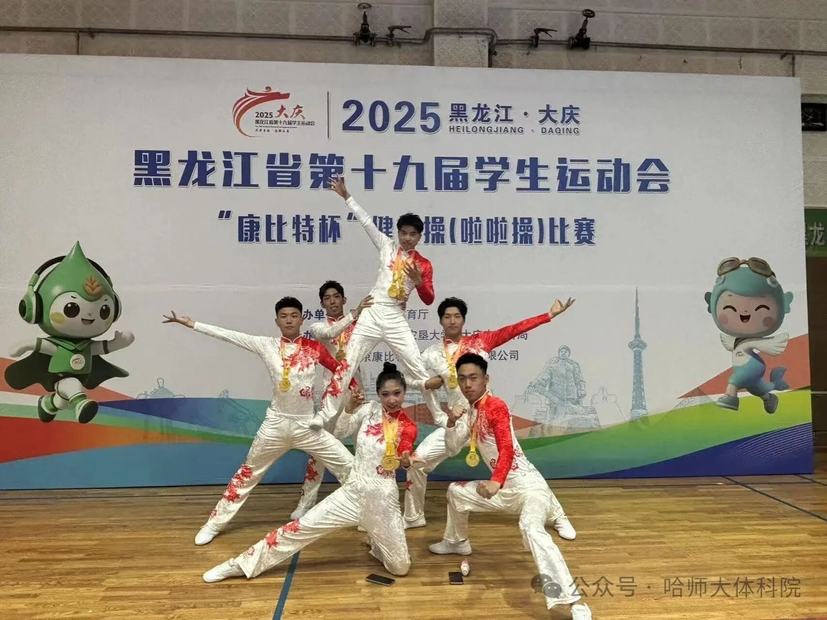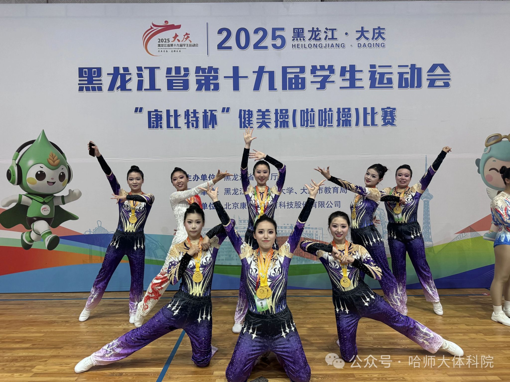本次出征省运会健美操项目的队伍由韩大伟担任领队,肖宁宁、鲁承琨担任教练,男女共19名运动员组成,经过激烈比拼,用充满激情的表演和协调一致的动作征服了评委,取得了乙组团体冠军和所有参加的5个单项金牌。成绩如下: