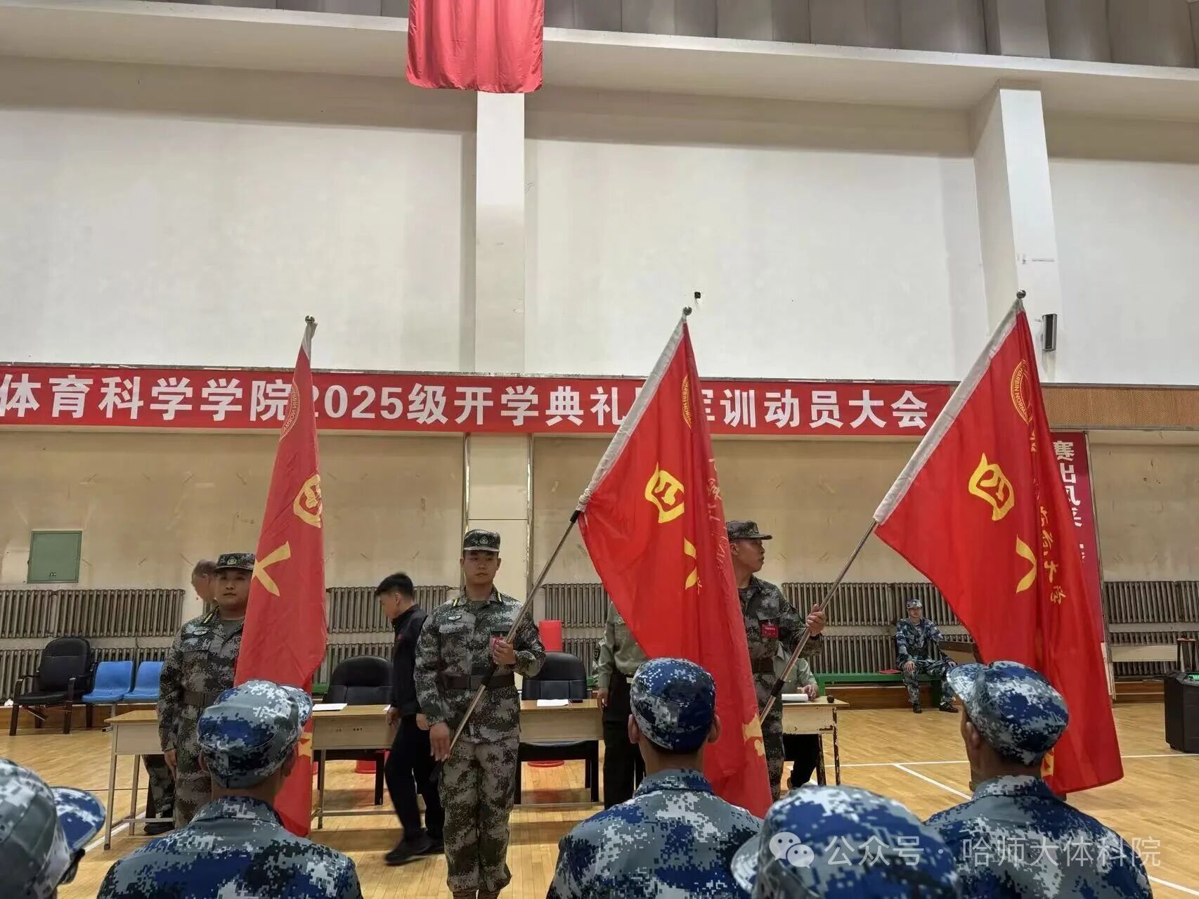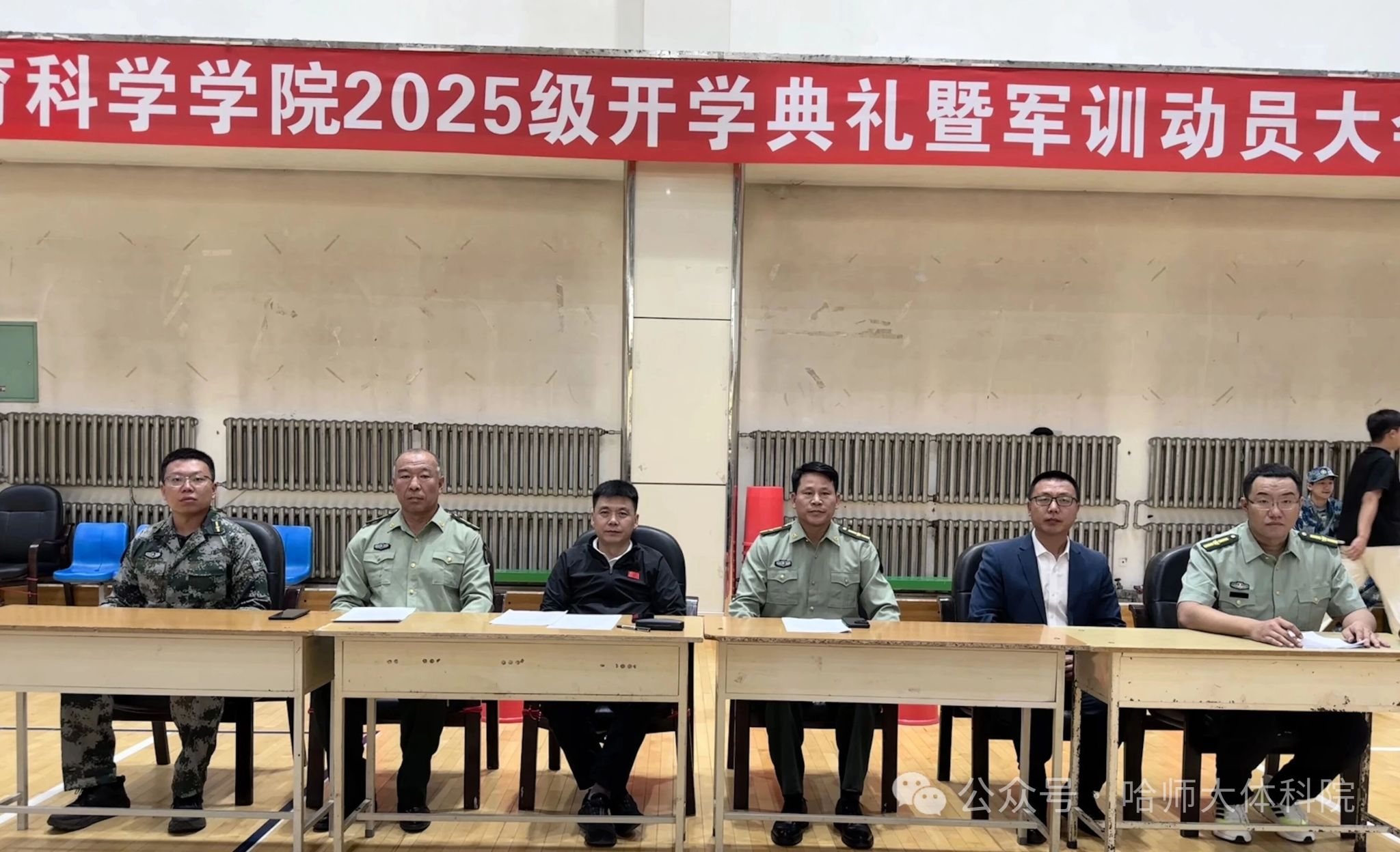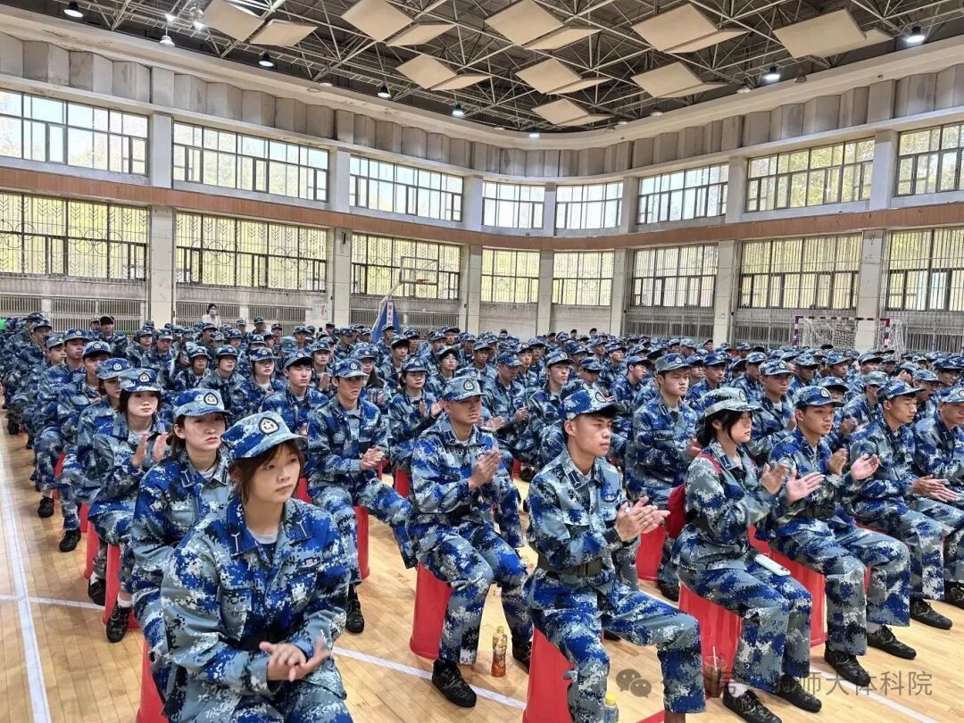 2025级新生军训动员大会在运动训练馆举行。学院党委书记韩大伟、院长孙长良、党委副书记冯铁南、副处级辅导员刘万鹏,学工办副主任兰兴滨,2025级辅导员李朝旭及2025级本科新生参会,会议由学工办副主任兰兴滨主持。