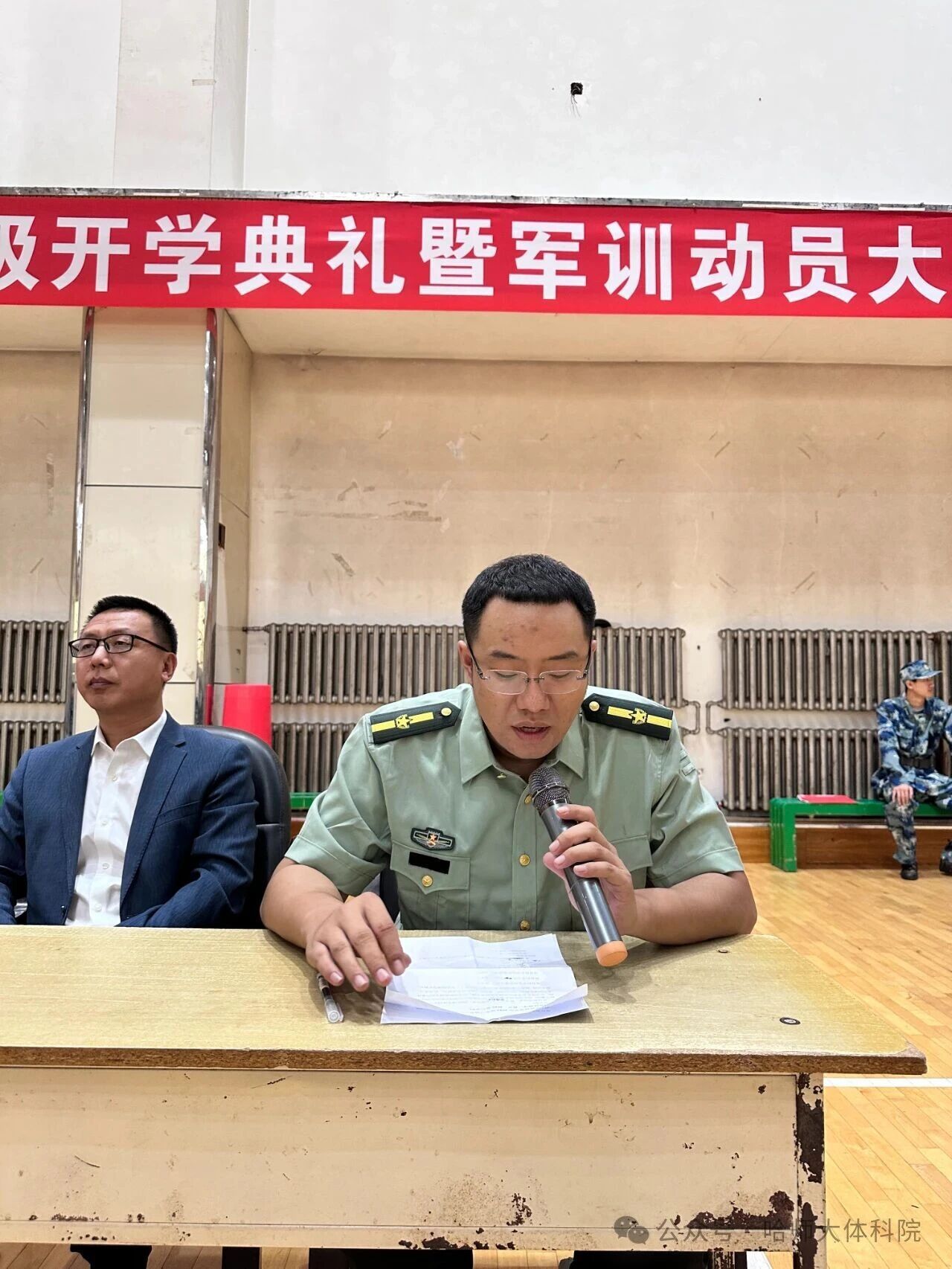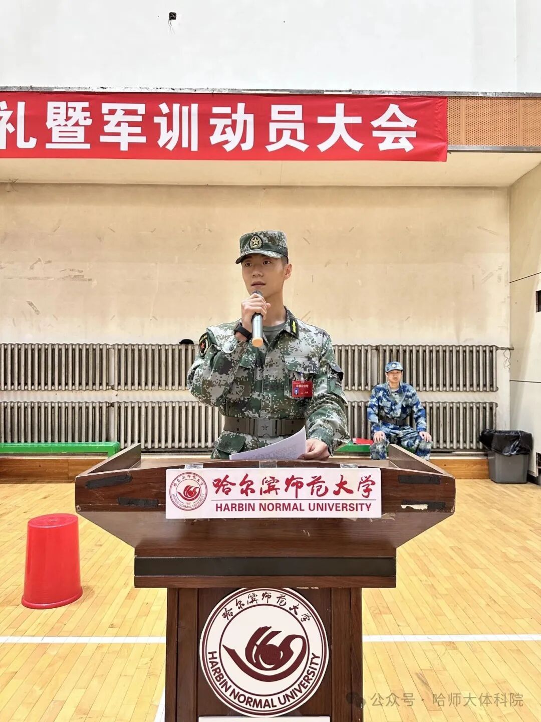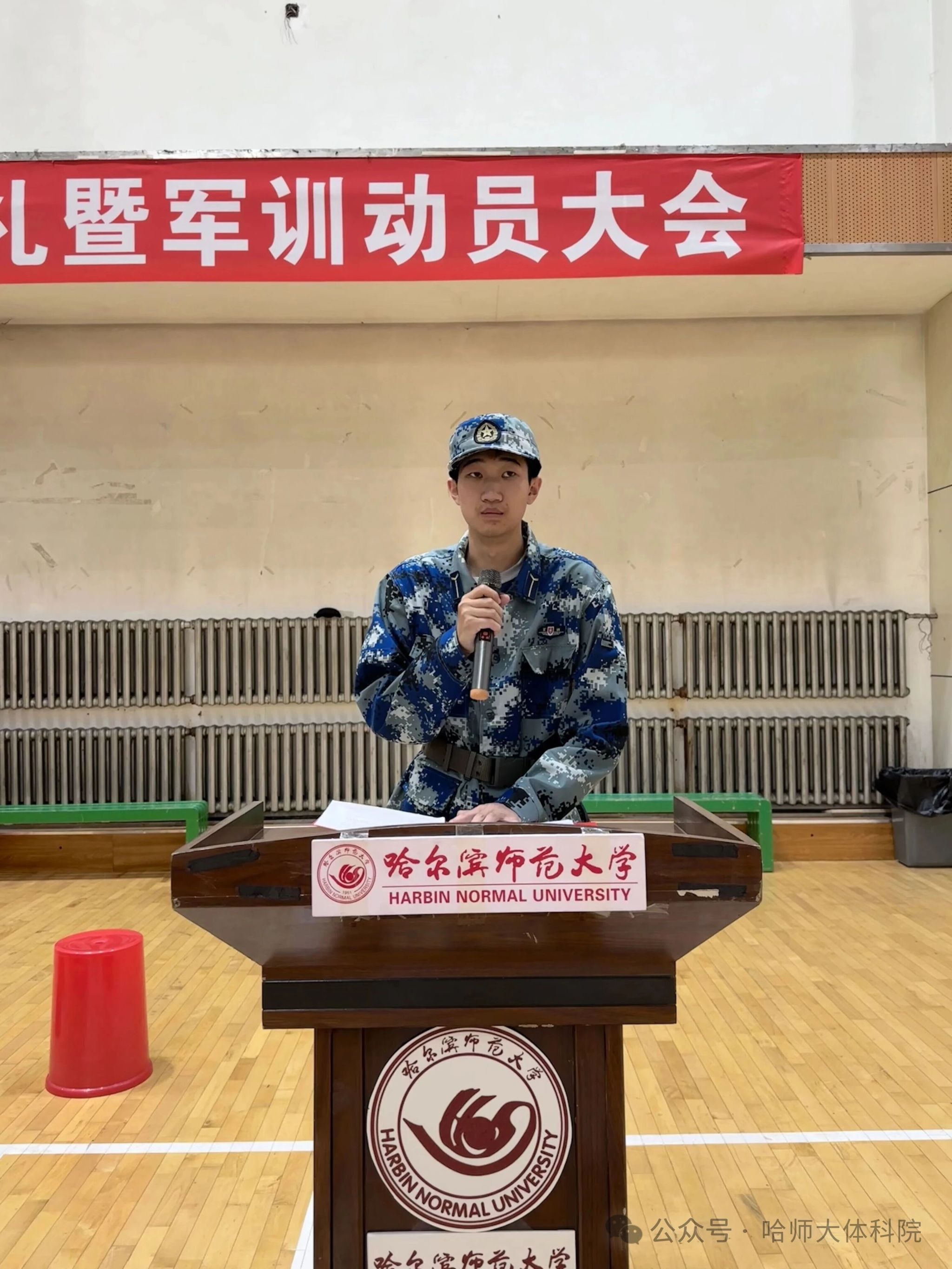 大会第一项,2025级军训学生代表2025级武术与民族传统体育杨王旭发言。