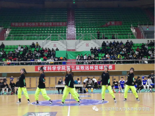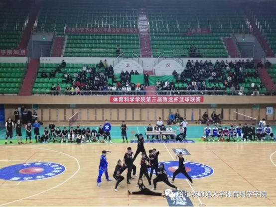 中场休息时间,2018级的民族传统体育专业的同学们登场了,在音乐的衬托下,他们完成了每一个高难度的动作,他们用特别的方式为队员们加油助威。