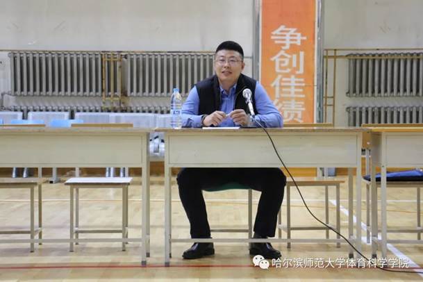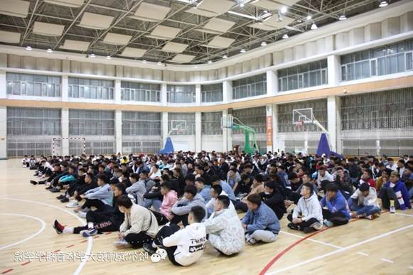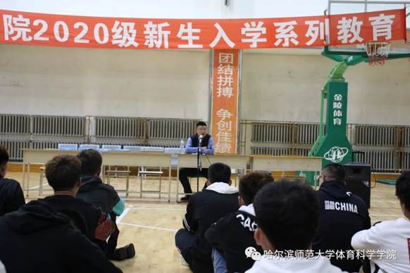 在体育训练馆举办2020级新生寝室安全和管理讲座,由2017级辅导员田野老师担任主讲。