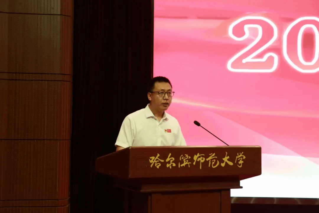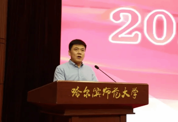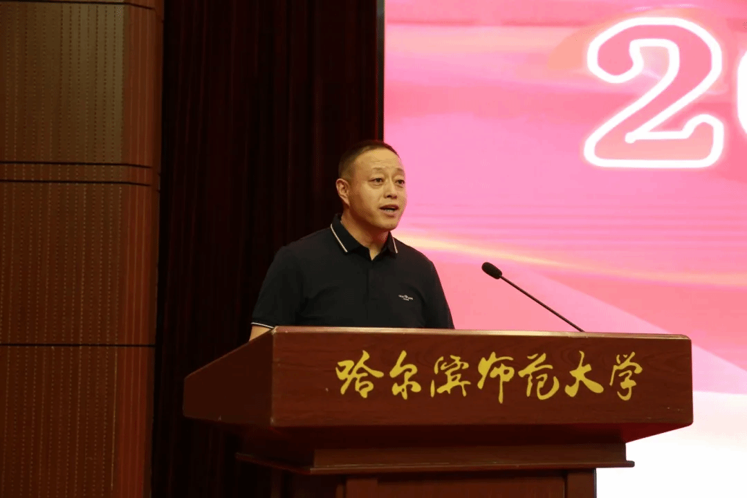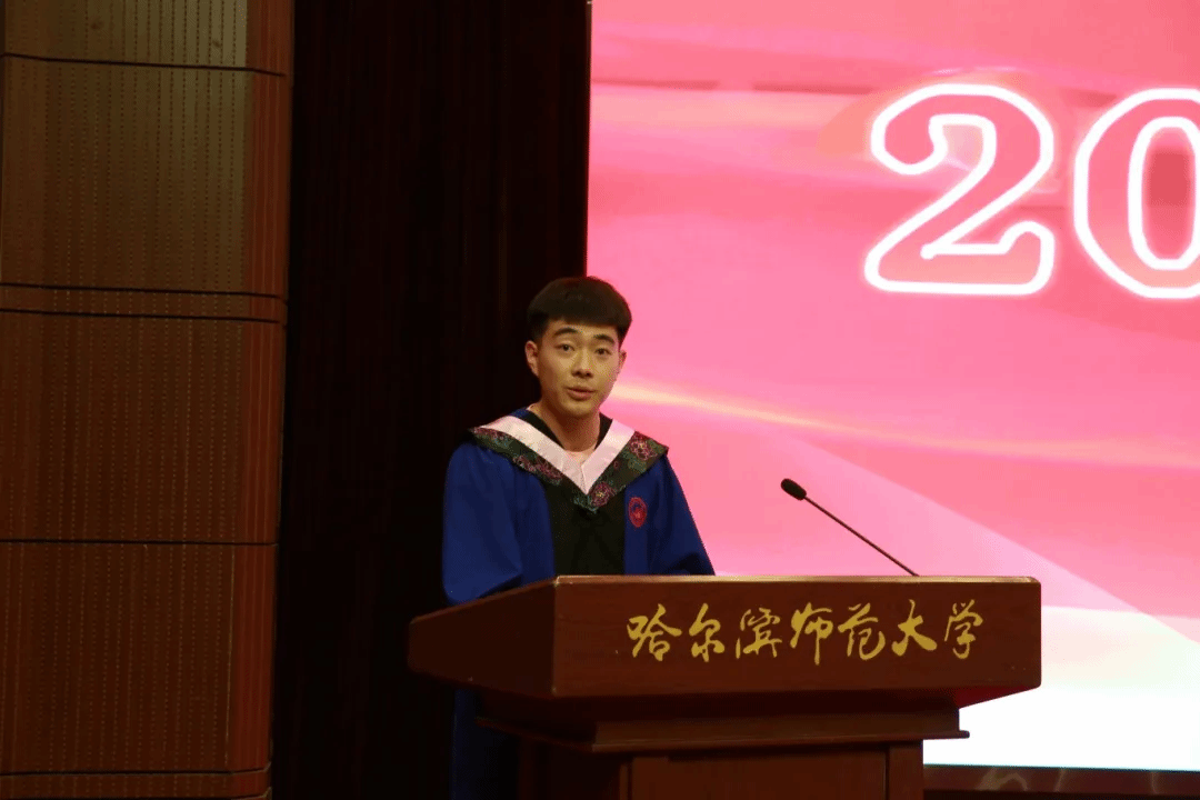 党委书记韩大伟讲话。他鼓舞本硕毕业生:要以习近平新时代中国特色社会主义思想为指引,坚定理想信念,践行初心使命。要发扬体育人敢于拼搏、勇于进取的精神,胜不骄败不馁,志存高远、脚踏实地,不畏艰难险阻,勇担时代使命,把个人的理想追求融入国家事业的建设中。要立德修身,服务社会。新时代青年要明大德,锤炼为民情怀品格。应当自觉继承并弘扬中华传统美德和哈师大校训“敦品励学 弘毅志远”,为祖国的建设、特别是为祖国的教育事业、为祖国伟大复兴的中国梦贡献自己的力量。