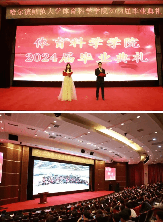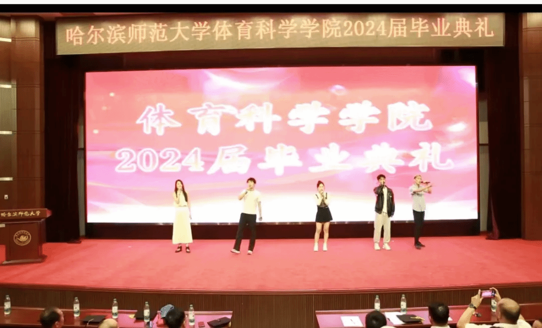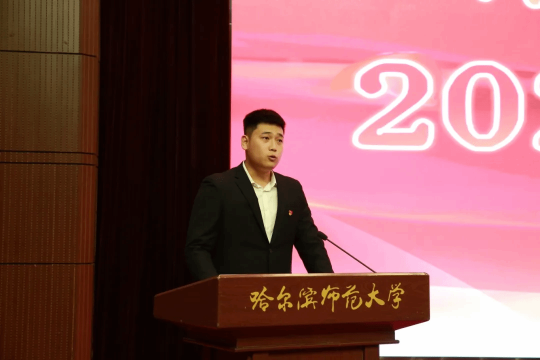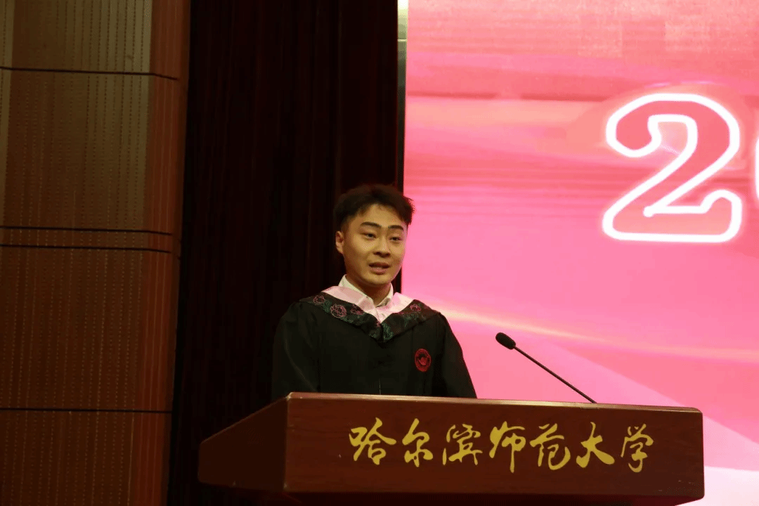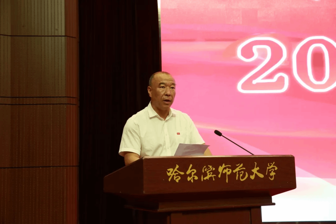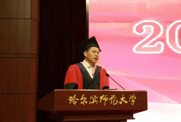 党委书记韩大伟讲话。他鼓舞本硕毕业生:要以习近平新时代中国特色社会主义思想为指引,坚定理想信念,践行初心使命。要发扬体育人敢于拼搏、勇于进取的精神,胜不骄败不馁,志存高远、脚踏实地,不畏艰难险阻,勇担时代使命,把个人的理想追求融入国家事业的建设中。要立德修身,服务社会。新时代青年要明大德,锤炼为民情怀品格。应当自觉继承并弘扬中华传统美德和哈师大校训“敦品励学 弘毅志远”,为祖国的建设、特别是为祖国的教育事业、为祖国伟大复兴的中国梦贡献自己的力量。